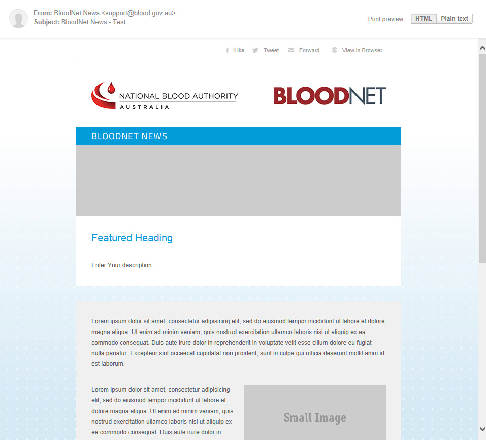 We are shortly going to launch an HTML based email newsletter called 'BloodNet News' to go out to the 5000+ users in hospital laboratories across Australia of one of our ICT systems (BloodNet - an online inventory management and ordering system for blood and blood products).