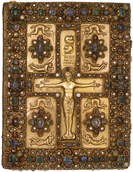 - Black background with gold logo and writing on cover page.. Gems and old bible look