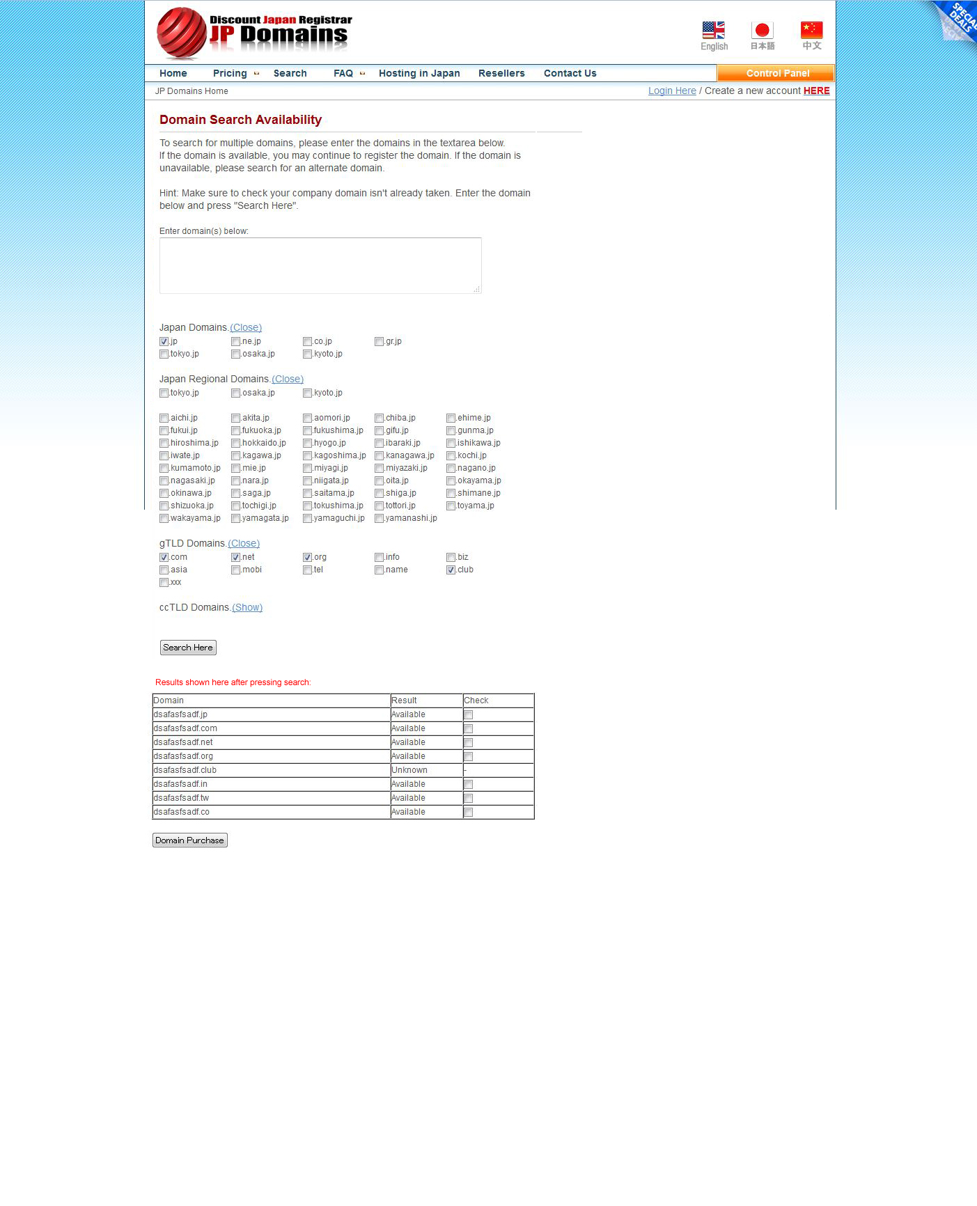 Domain Search Page and Results