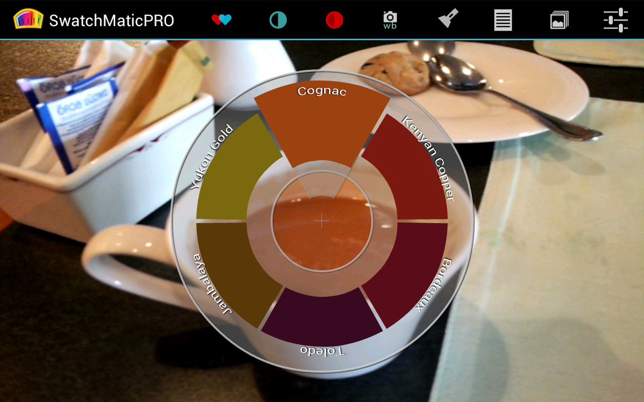 You can see a screen grab of the app as I sample my morning coffee. Depending on the settings I use on this page, I will get a shareable image of the resulting color palette that has one robot (showing analog colors), two robots (showing analog and complement colors), or three robots (showing analog colors and two triad colors - 120 degrees in either direction on the color wheel). You can see samples of all these palette styles in the attached files.