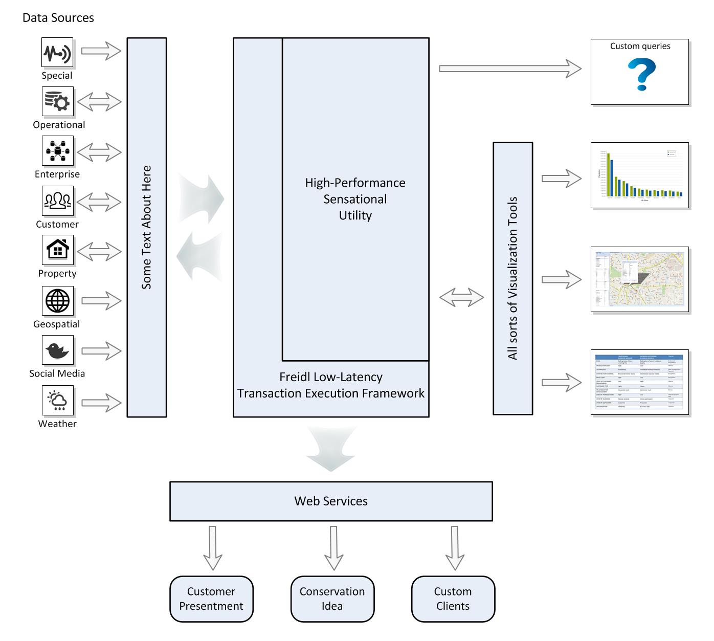 I have a software architecture that we would like to pretty up. Our current drawing was done in VISIO, but it just doesn't look professional (and salesy) enough. We would like an illustration that is attractive, makes simple use of colour, and allows us to make little tweaks (wording, etc.). We used icons for certain concepts, but these will have to be redrawn (or purchased). This particular software application is able to receive many data points, store it in a high performance data store, and make it available to various users for analysis or other systems for other purposes